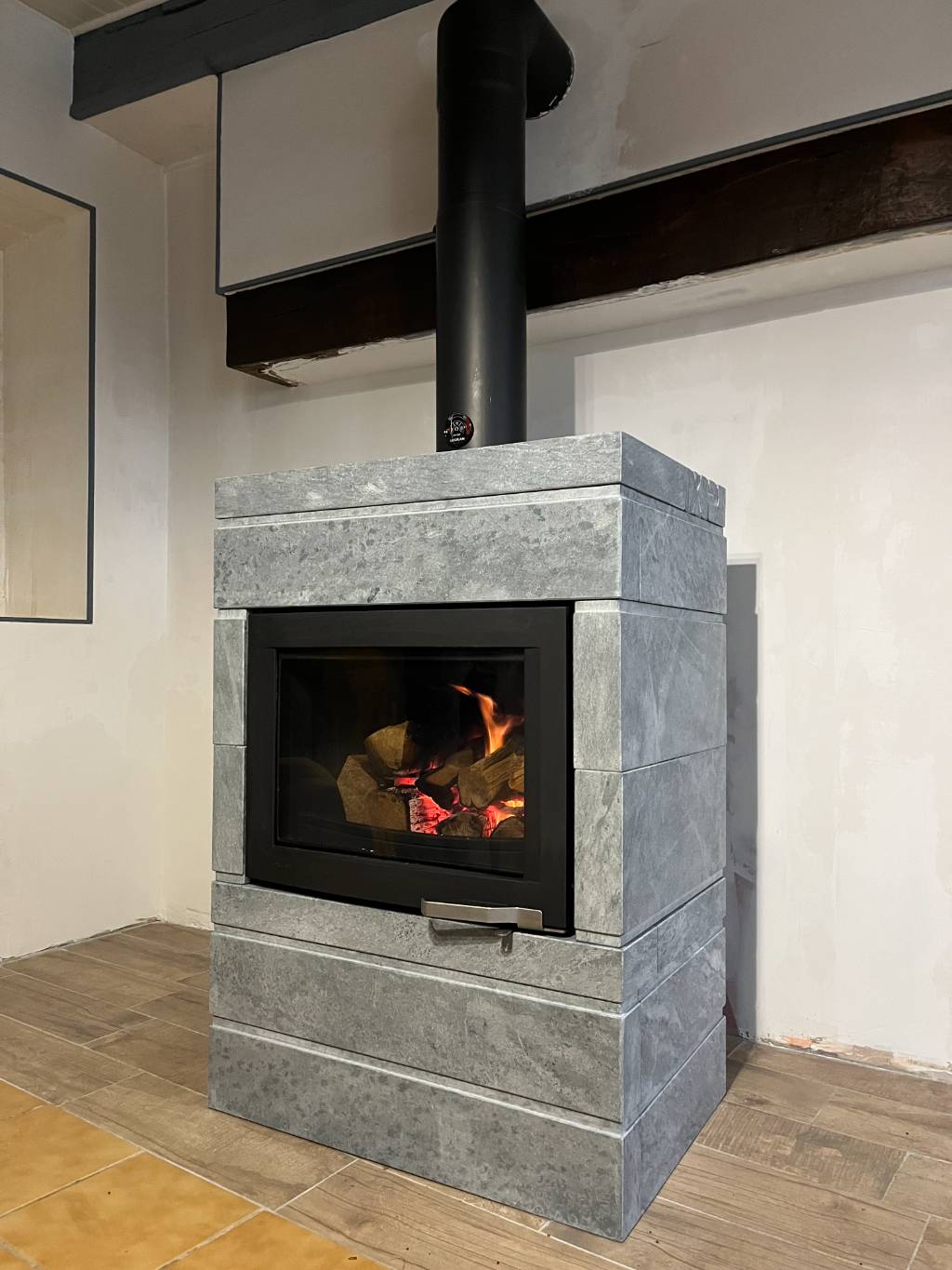 Nous avons réalisé l'étude thermique et technique du projet et le conseil sur le choix du poêle de masse adapté au logement. Nous avons effectué la préparation en nettoyant le conduit existant , la création et adaptation du conduit de fumée pour répondre aux normes en vigueur.